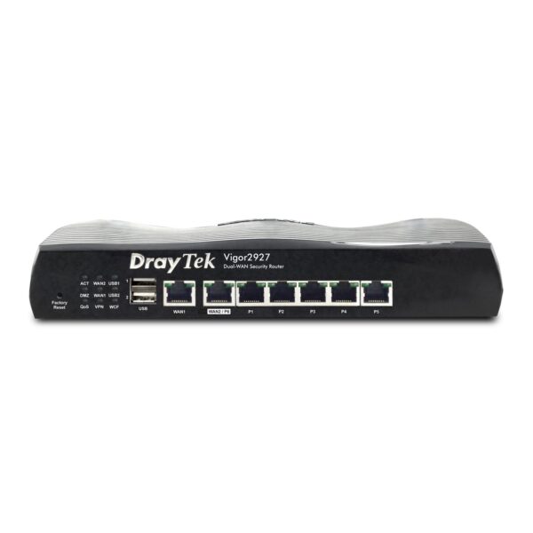 The DrayTek Vigor 2927 – Dual-WAN Load Balancing Firewall VPN router allows you to make the most of FTTP Fibre Broadband with Gigabit WAN throughput, extensive Firewall, Content Filtering, VPN client/server and Quality of Service controls.
